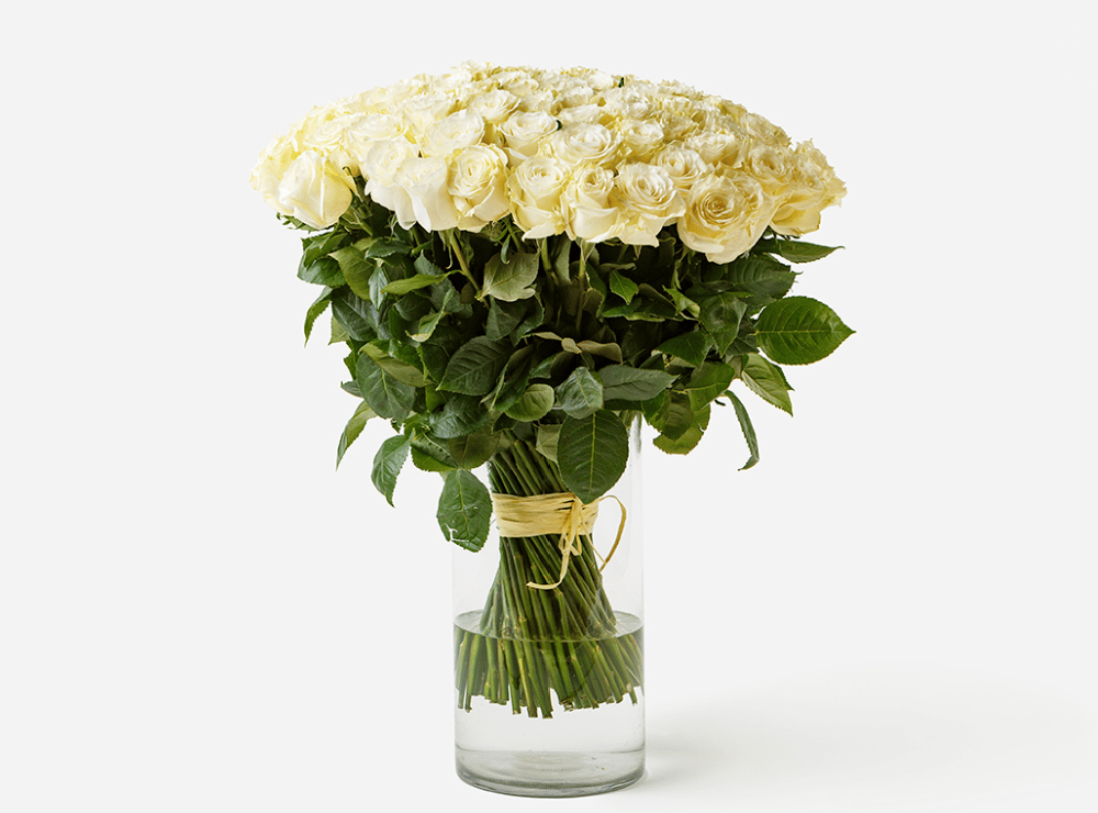 101 rose bianche dell'Ecuador, alte 70–80 cm. Fiori dall'Ecuador soleggiato.