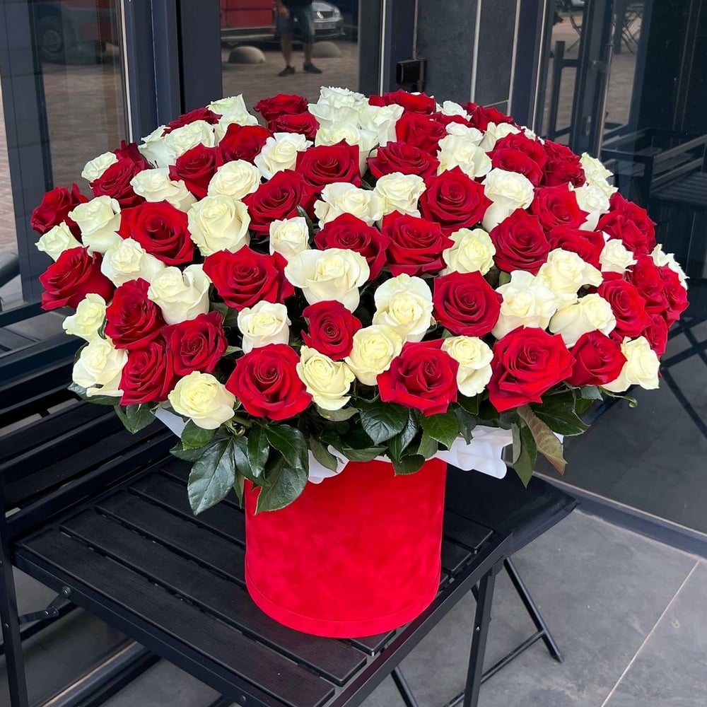 Hat box con fiori '101 rose rosse e bianche'