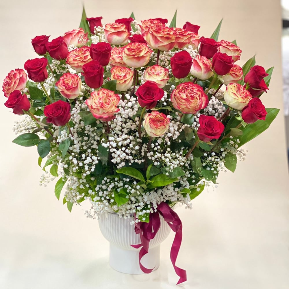 In questa disposizione: 40 rose a gambo lungo — 350 $; 30 rose a gambo lungo — 300 $; 20 rose a gambo lungo — 250 $. Il colore può variare secondo le preferenze del cliente: bianco, rosso, rosa — in un unico colore o in diversi.