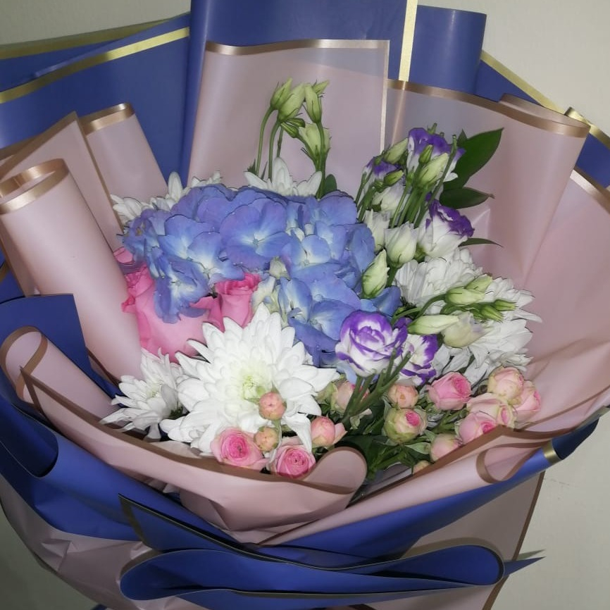Ortensia blu al centro del bouquet come un brillante accento che vuoi fare per mostrare i tuoi sentimenti calorosi.