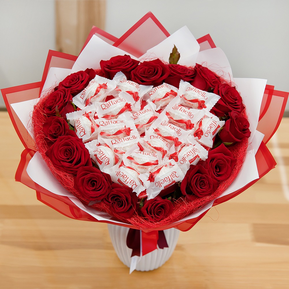 Questo bouquet è un'espressione di amore e ammirazione. Le rose rosse, simbolo di passione profonda e rispetto, sono elegantemente incorniciate e accompagnate da una scatola di cioccolatini Raffaello. Questo bouquet parla più forte di quanto mille parole possano esprimere.