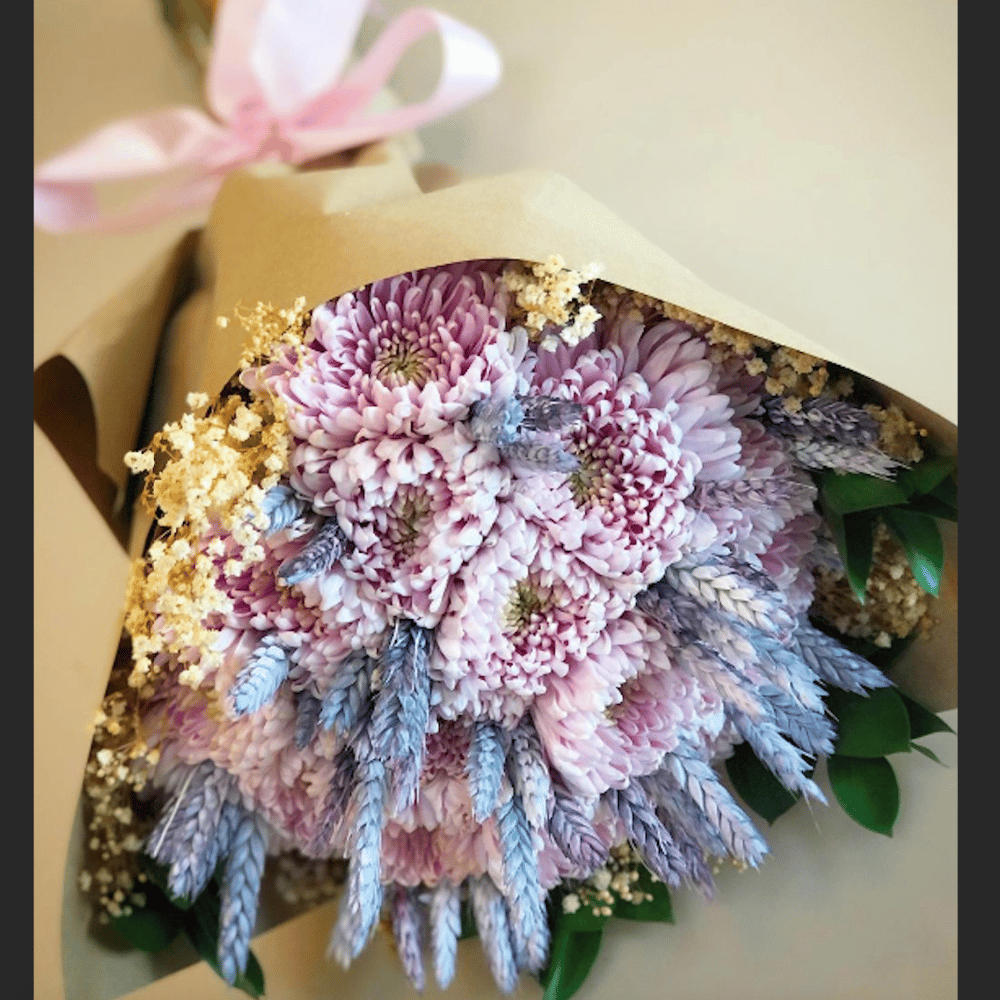 Bouquet di crisantemi premium con grano tinto e fogliame. Questa composizione è elegante e di ottimo gusto. Rappresenta il gusto squisito per i fiori e i design autentici e diversi.