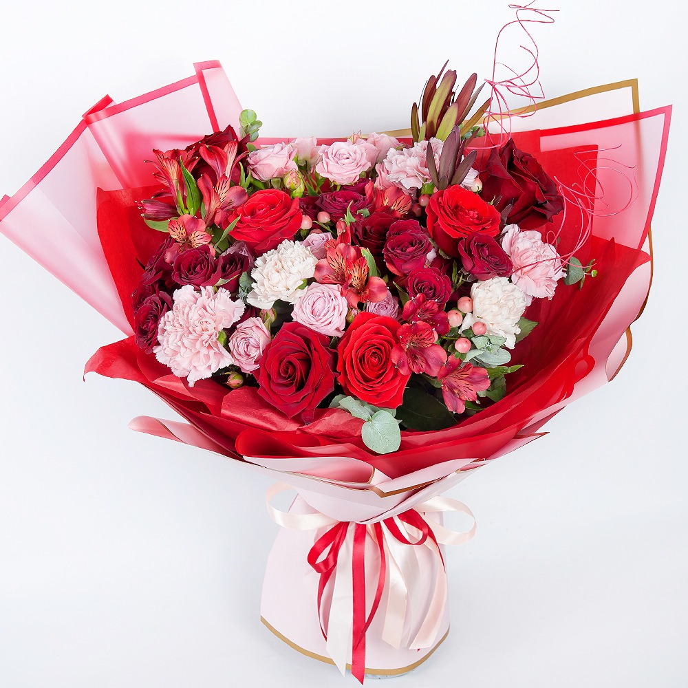 Questo magnifico bouquet è composto da garofani, rose cespuglio e scarlatte alte 50 centimetri. È completato da alstroemeria, eucalipto cinerea, leucantemo e iperico. I fiori sono disposti in uno s...
