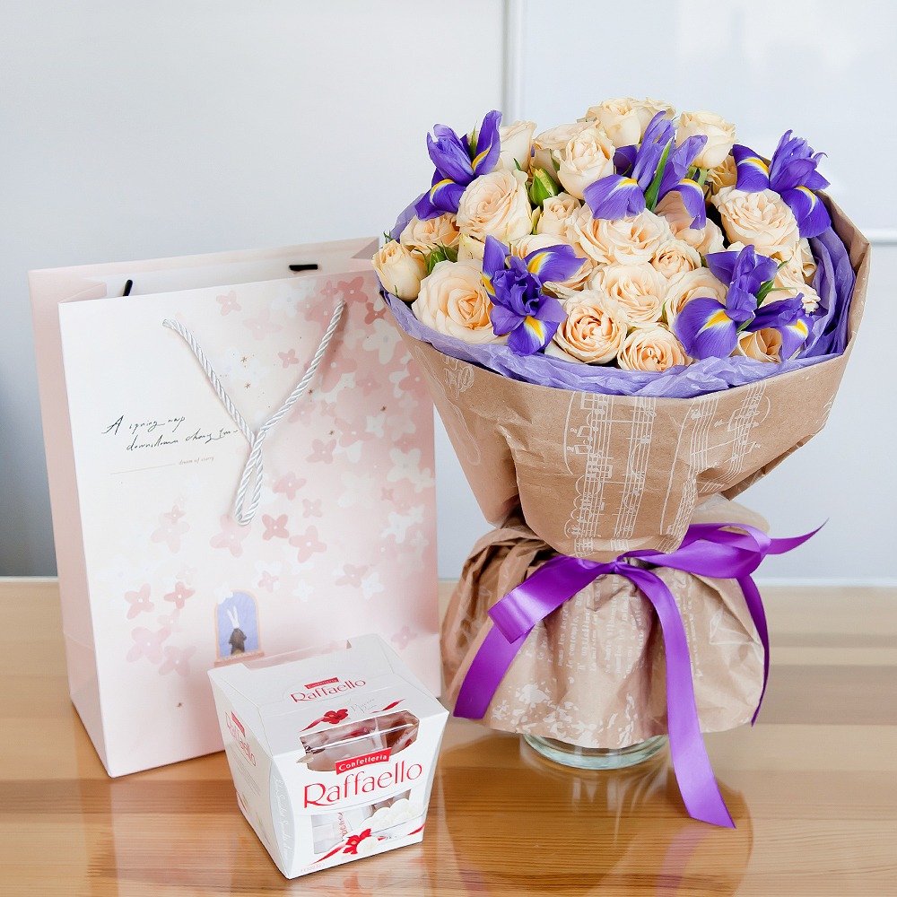 La composizione regalo è il modo perfetto per esprimere il tuo amore, gratitudine o rispetto. In questa composizione, troverai una scatola di cioccolatini Raffaello e un bouquet chiamato "Attrazione" composto da rose a grappolo e iris. I delicati cioccolatini Raffaello saranno un meraviglioso complemento a qualsiasi festa, e il bouquet "Attrazione" regalerà una sensazione di primavera e freschezza. Questa composizione sarà un regalo eccellente per qualsiasi occasione - dal compleanno alla festa professionale. Porterà gioia e piacere a chi la riceverà.