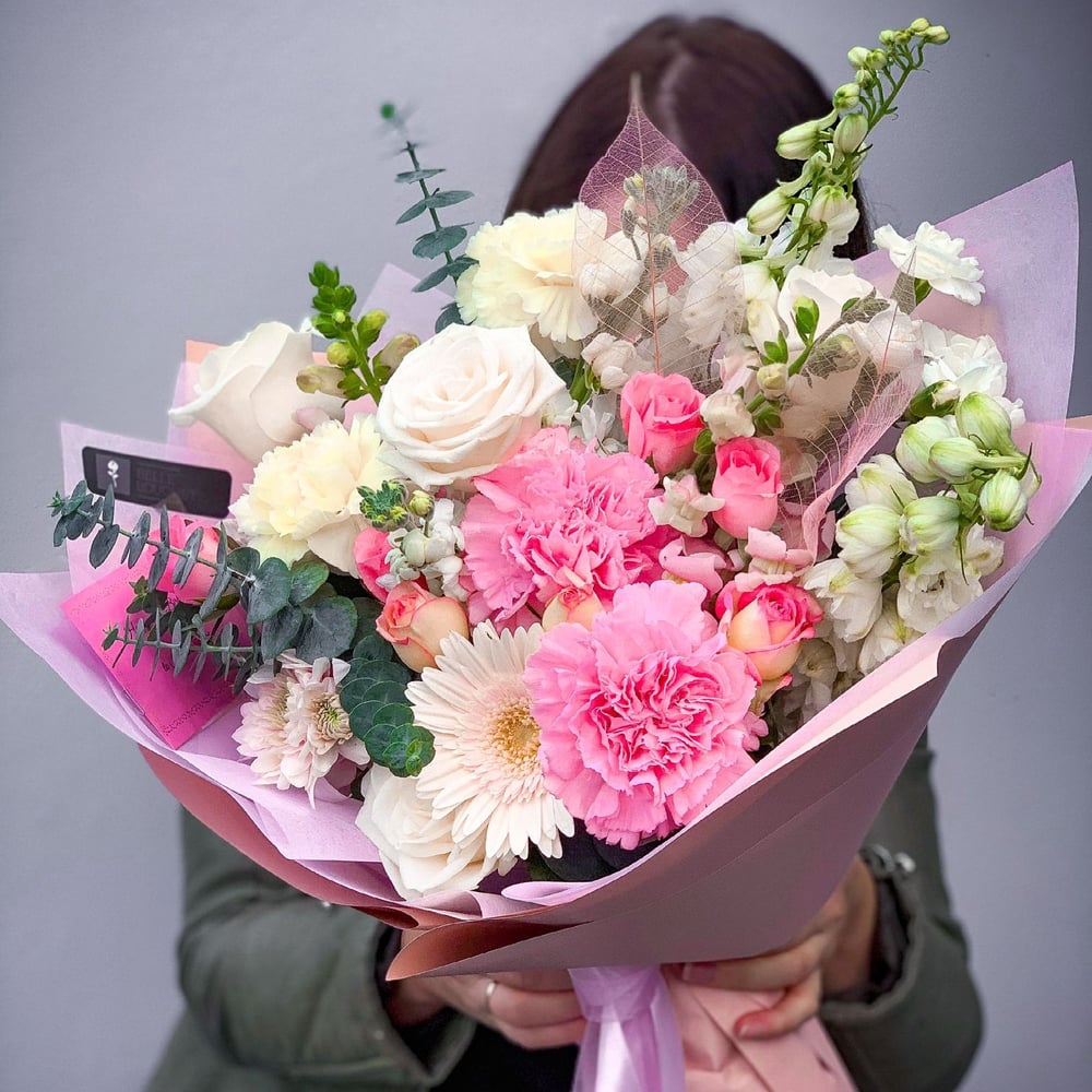 Un bouquet mozzafiato in tonalità pastello tenui, che irradia eleganza e romanticismo.