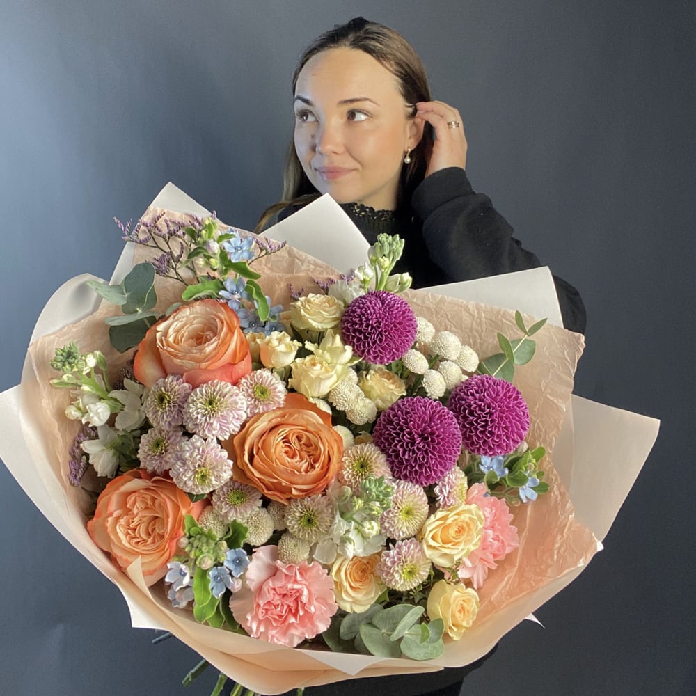 Il bouquet include rose Kahala, crisantemo, tweedia, rose spray, momoko, eucalipto, ecc.. La dimension è grande. L'altezza è di 50 cm. Nota: Lavoriamo con fiori freschi di stagione, quindi la composizione del bouquet può variare un po'. Anche in assenza di un fiore di stagione, cerchiamo di raccogliere un bouquet il più simile possibile. Se un particolare fiore è importante per te, ti preghiamo di contattarci con la nota e ci metteremo d'accordo sulle opzioni con te.