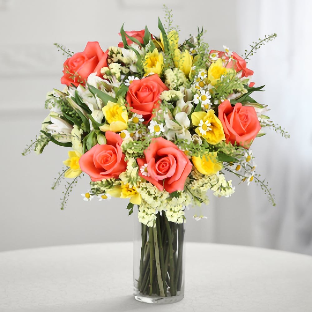 Mazzo 'Caramello extra: Narcisi, Rose e Alstroemerie'