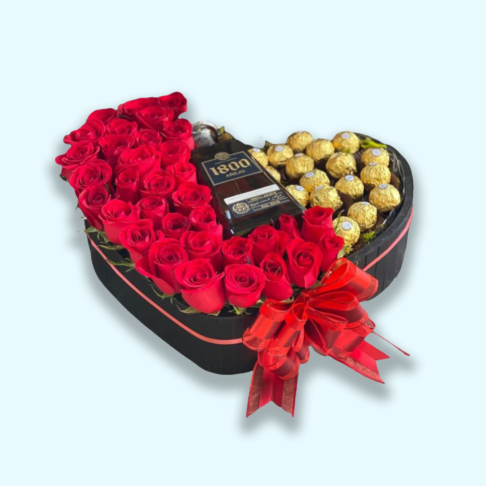 Bellissimo arrangiamento floreale composto dalla più fine selezione di fiori, realizzato in un bellissimo cuore artigianale di legno. 40 rose rosse. Fini fogliami. 16 cioccolatini Ferrero. 1 bottiglia di tequila 1800 Añejo. Bellissimo cuore artigianale di legno.
