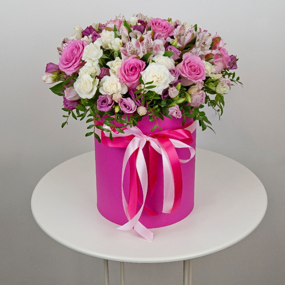 Il bouquet nella scatola a cappello "Cocquetta" è l'incarnazione della tenerezza e dell'eleganza, creato con alstroemerie, eustoma, rose rosa e rose a mazzetto, completato da pistacchi. Questo bouq...