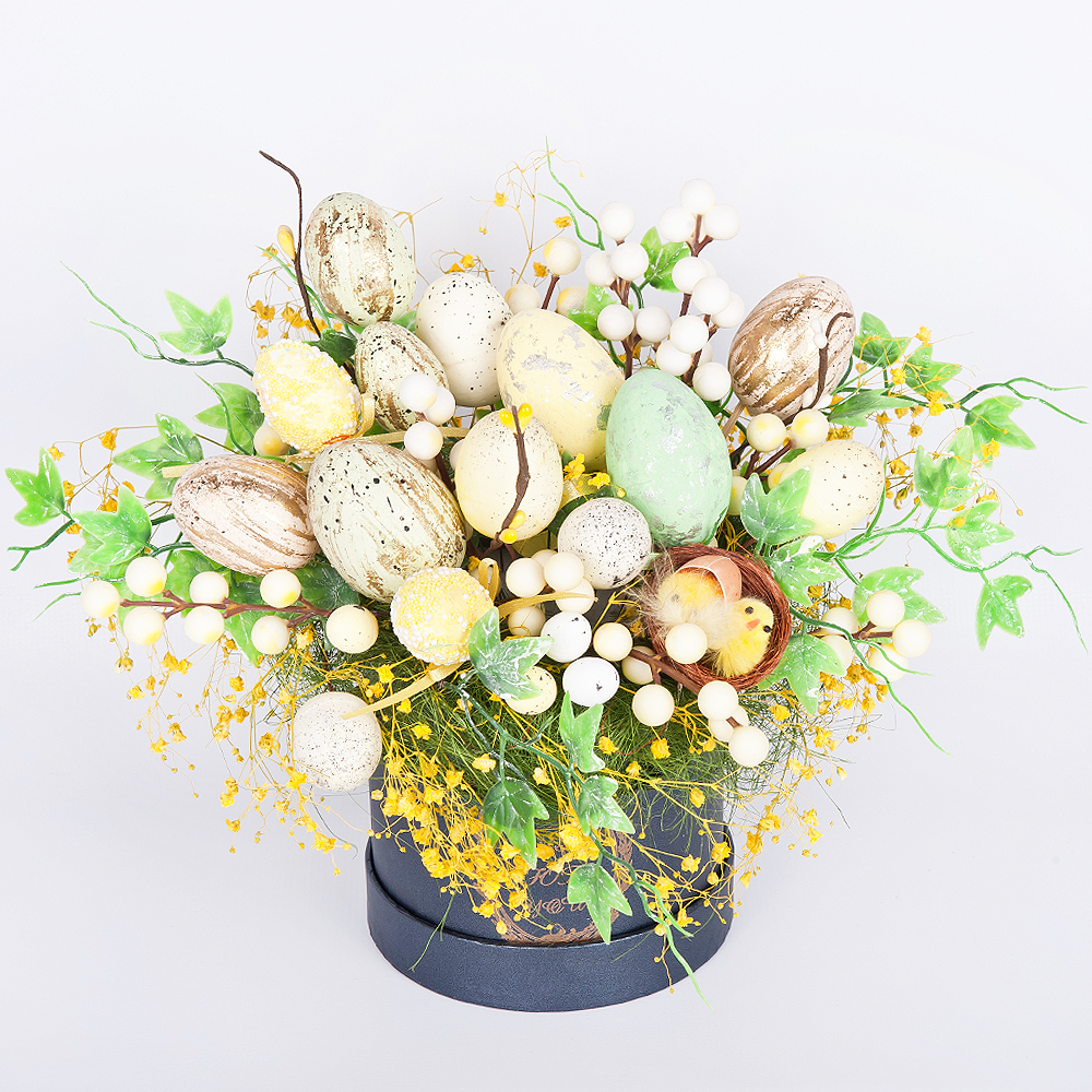 La composizione pasquale è un regalo affascinante che regalerà al destinatario una sensazione di festa e gioia. La composizione è realizzata con freschi gipsofila e arricchita da elementi decorativi sotto forma di uova dipinte. Delizierà il destinatario con la sua bellezza e il suo profumo per diversi giorni. La composizione pasquale sarà un regalo meraviglioso per Pasqua, un anniversario o un traguardo importante, e può anche essere utilizzata come segno di apprezzamento o gratitudine.