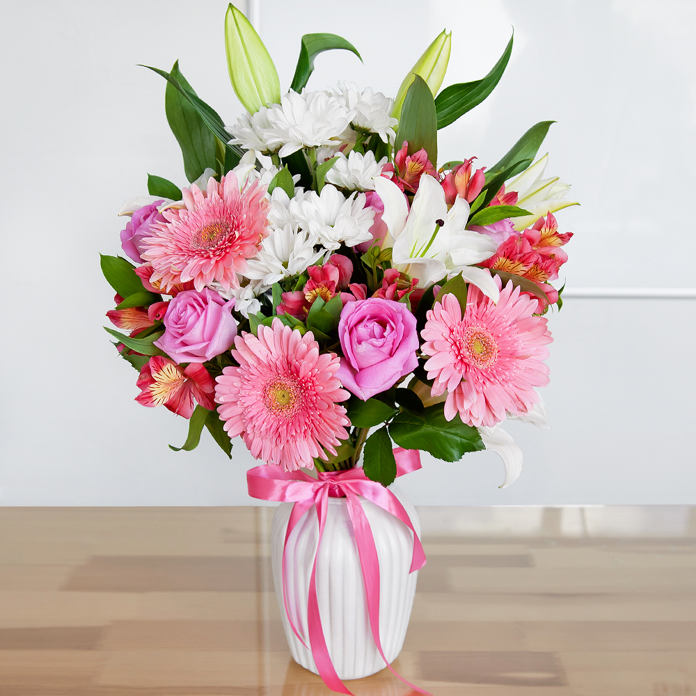La magnifica combinazione di fiori rosa e bianchi, che ha trovato posto in questo bouquet, è sicura di deliziare il destinatario.