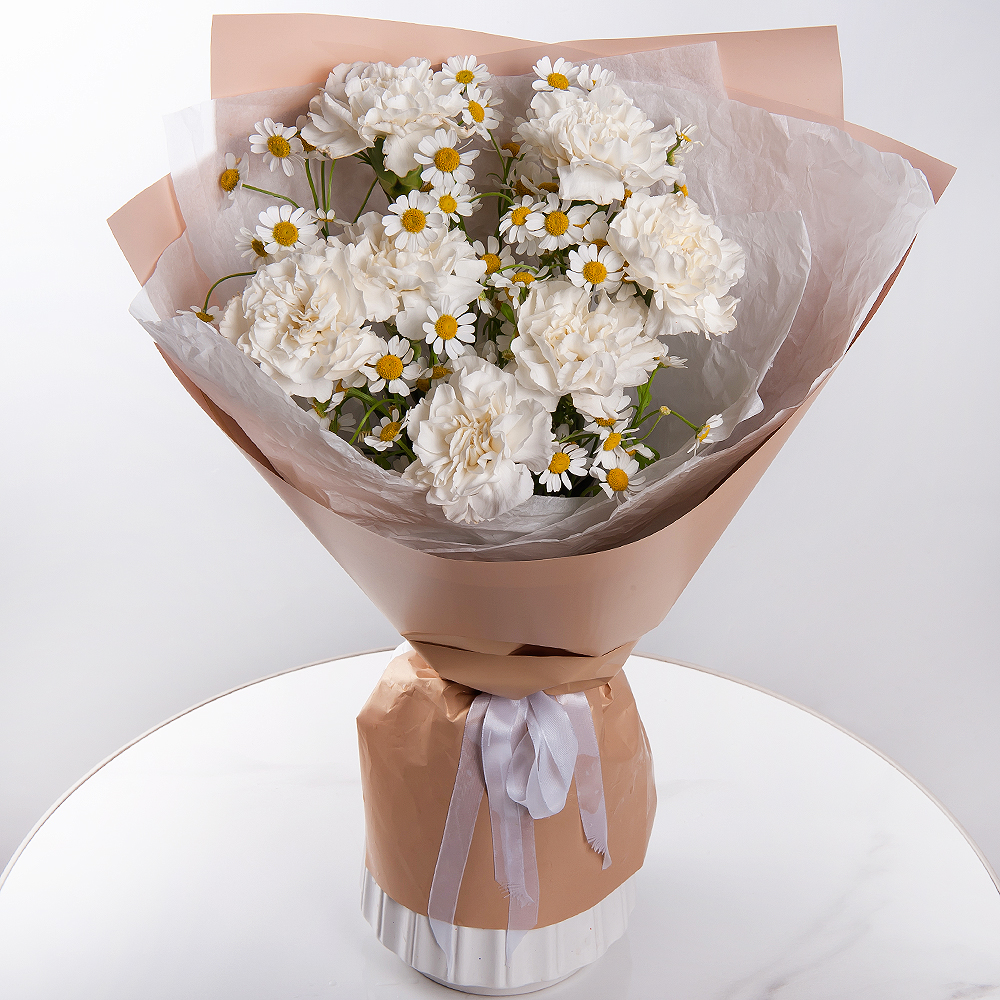 Questo bouquet è come una danza di leggere nuvole nel cielo. Garofani e tanaceto creano una composizione ariosa e delicata. La confezione moderna sottolinea la raffinatezza del bouquet, che sarà il regalo perfetto per i momenti più romantici.