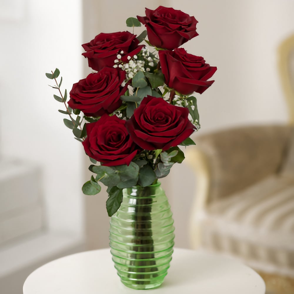Questo grazioso mazzolino è una sorprendente combinazione di fiori rossi e bianchi. Fai sentire amata una persona speciale con un bellissimo e classico mix di rose rosse e delicato velo da sposa in una cornice elegante di eucalipto silver dollar.