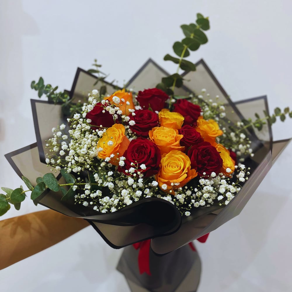Mazzo magnificamente avvolto: otto rose rosse, nove rose gialle, sei steli di gypsophila bianca e quattro steli di eucalipto.