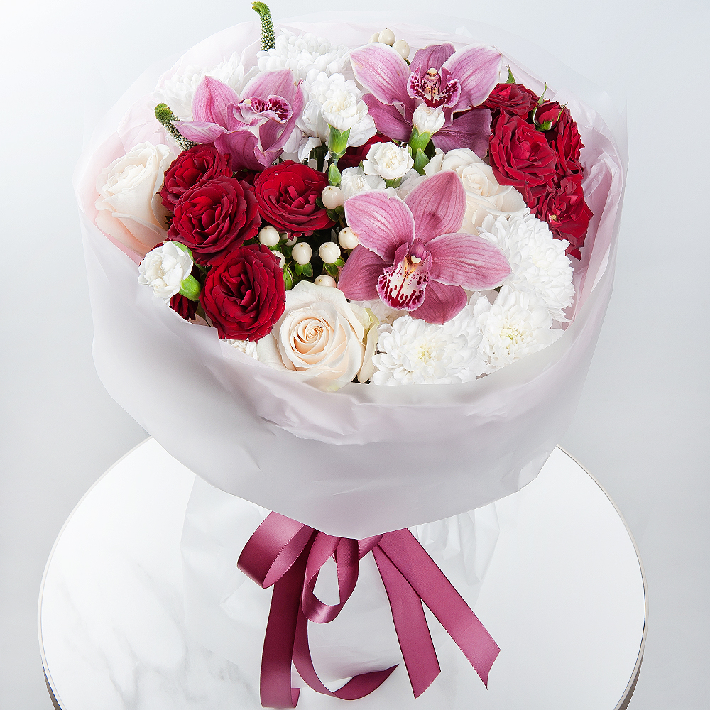 Il bouquet combina una varietà di fiori che simboleggiano amore e affetto. Garofani, rose bianche, crisantemi e orchidee, incorniciati da iperico e veronica, creano una composizione sorprendente. La confezione moderna enfatizza la raffinatezza del bouquet, rendendolo un'ottima scelta per esprimere i sentimenti più caldi.