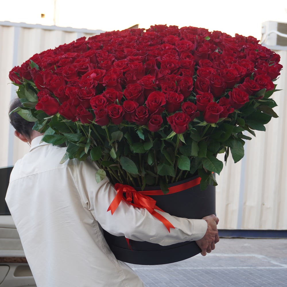 251 rose rosse in una scatola - regalo speciale per San Valentino. Scatola nera grande, steli lunghi 60 cm.
