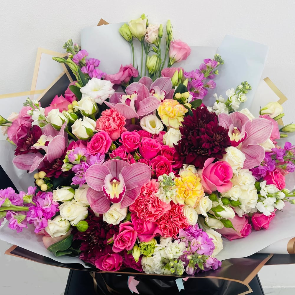 Bellissimo bouquet avvolto di 3 Eustoma rosa, 5 rose Revival pink, 3 iperico bianco, 2 garofani bicolore, 5 orchidee Cymbidium rosa, 3 crisantemi viola, 3 garofani rosa, 5 Matthiola bianche, 5 Matthiola lavanda, 3 rose spray crema, 4 rose spray rosa