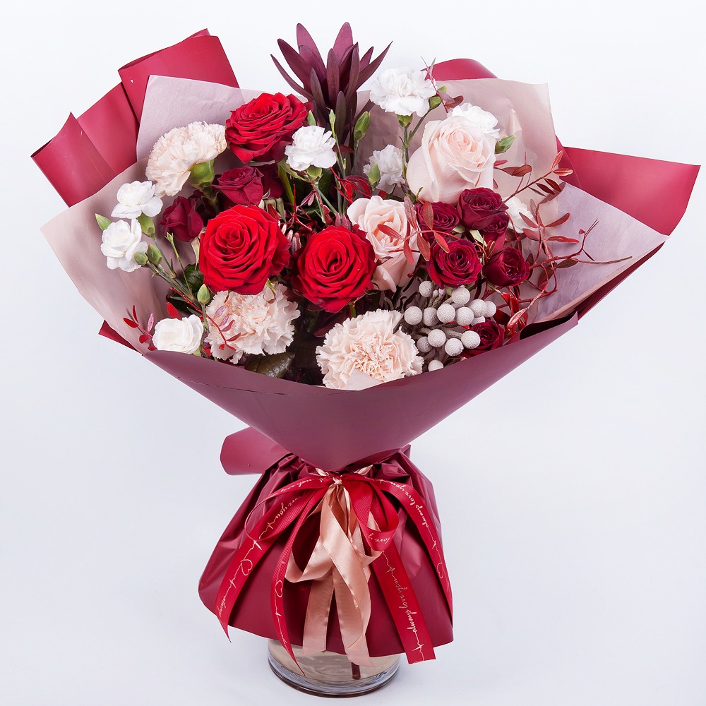 Immergiti nella bellezza enigmatica del bouquet Fascination. Appassionate rose rosse, rose crema, delicate rose spray, eleganti garofani, affascinanti spray di garofani e accenti di pistacchio, Brunia Green Lanuginosa e Leucadendron creano un'esposizione ipnotizzante. Presentato in un imballaggio moderno con un nastro, questo bouquet è un incantevole mix di eleganza e intrigo. Con il suo fascino misterioso, il bouquet Fascination Enigmatic lascerà un'impressione duratura.