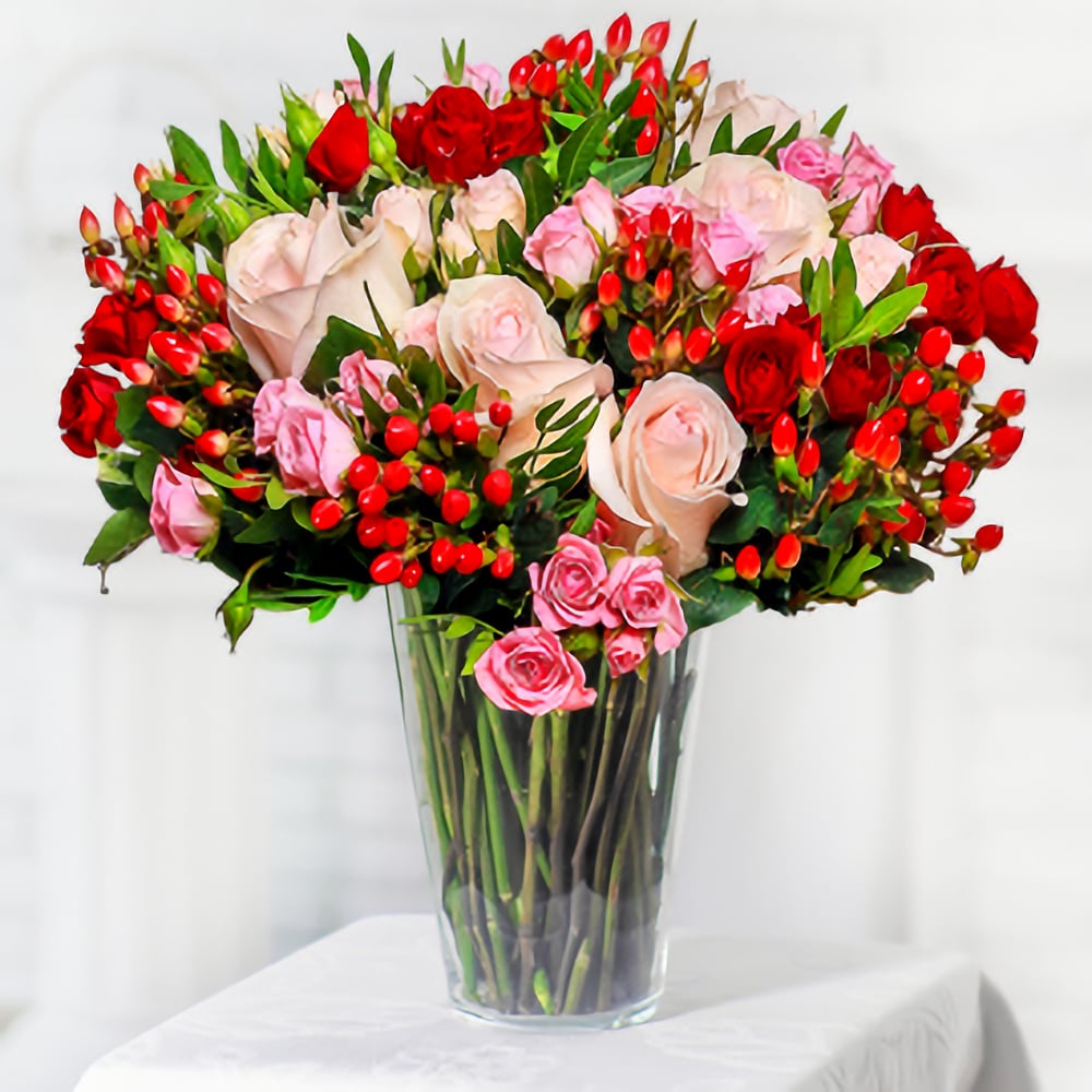 Questa magnifica e tenera composizione è creata da colorate ed eleganti rose spray con accenti vivaci di iperico rosso e pistacchio verde. Abbiamo progettato questo bouquet appositamente per le celebrazioni familiari e siamo sicuri che adornerà la vostra casa e porterà gioia e allegria in un giorno speciale!