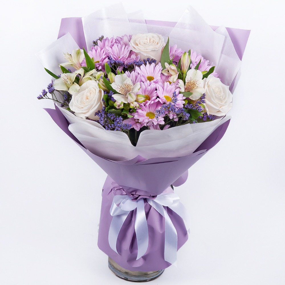 Le rose, quelle orgogliose bellezze bianche, sono circondate da romantiche margherite dorate rosa e toccanti alstroemerie. Questo sogno floreale è tessuto di fiori delicati e completerà i tuoi saluti in modo perfetto.