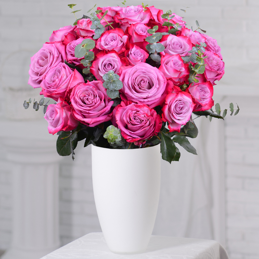 Questa ipnotizzante nuvola di viola può far perdere la testa a chiunque! La tonalità regale del viola incanta con la sua eleganza e profondità. Questo splendido bouquet di 25 rose viola è stato creato per impressionare!