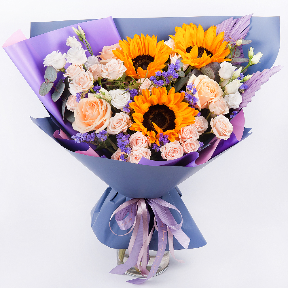Il bouquet "Notte di Giugno" è un'incredibile combinazione di lisianthus, girasoli, rose cespugliose e crema, statice, felce ed eucalipto "Cineraria", che regalerà al destinatario una sensazione di freschezza e leggerezza. Il bouquet "Notte di Giugno" è creato da esperti fioristi utilizzando solo fiori freschi. Delizierà il destinatario con la sua bellezza e il suo profumo per diversi giorni. Il bouquet "Notte di Giugno" sarà un regalo meraviglioso per qualsiasi festa estiva, matrimonio o anniversario, e può anche essere usato come segno di attenzione o gratitudine.