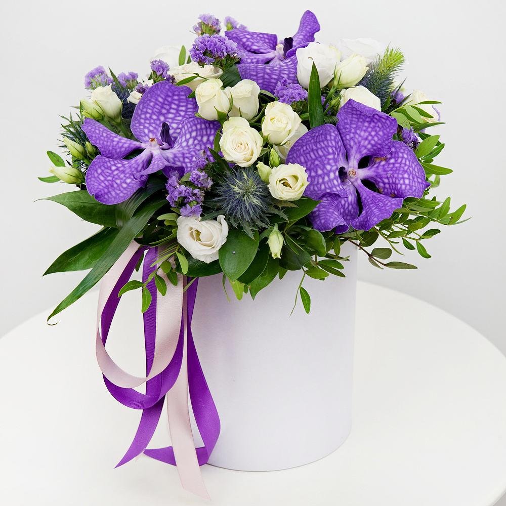 Questo incantevole bouquet di lisianthus bianchi e rose spray, arricchito con orchidee viola Wanda, è un modo delizioso per mostrare a qualcuno di speciale quanto ci tieni. Pieno di dolci sentiment...