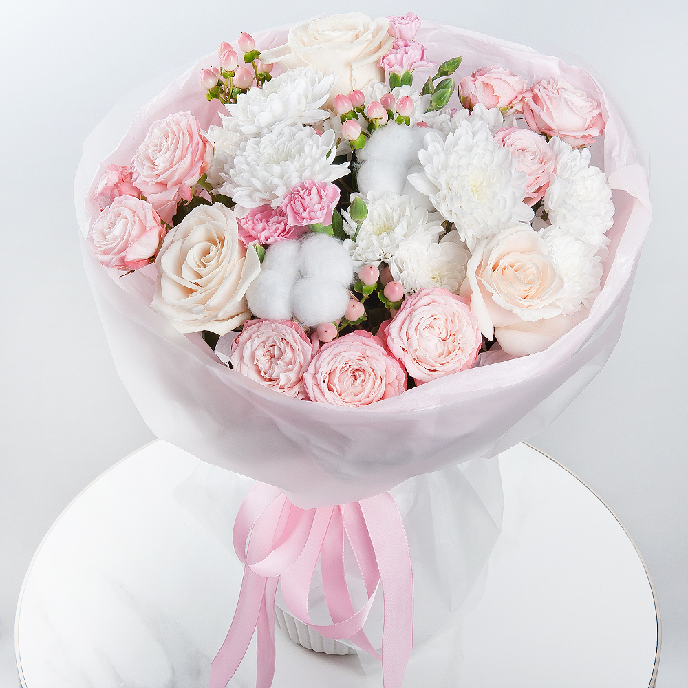 Nel bouquet, come in una delicata nuvola, si combinano crisantemi a cespuglio, rose simili a peonie e garofani con iperico. Completato da boccioli di cotone, il bouquet crea un'atmosfera di tenerezza e raffinatezza. Il moderno imballaggio enfatizza la bellezza del bouquet, che è perfetto per esprimere le emozioni più sincere.