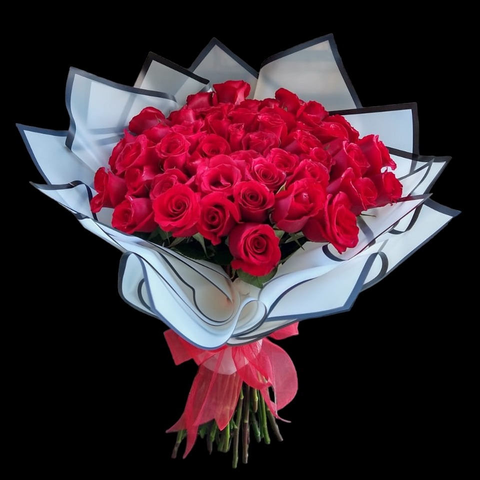 Bellissimo mazzo realizzato con la più fine e fresca selezione di rose e fogliame. È composto da 50 rose, carta francese e nastro decorativo.