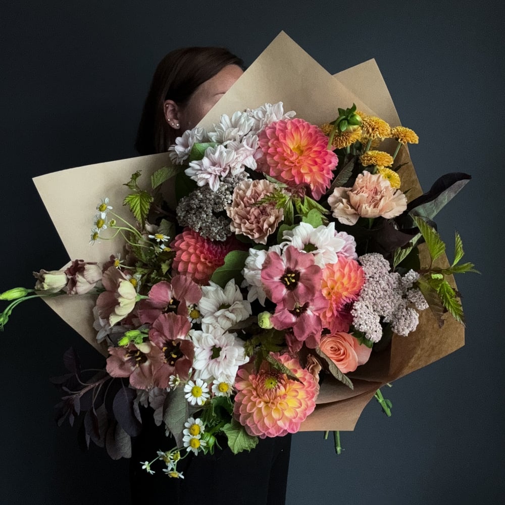 Il bouquet è composto da dalie, rose, garofani, verde, eucalipto. La dimensione è media. L'altezza è di 50 cm. Nota: Lavoriamo con fiori freschi di stagione, quindi la composizione del bouquet può variare un po'. Anche in assenza di un fiore di stagione, cerchiamo di raccogliere un bouquet il più simile possibile. Se un particolare fiore è importante per te, ti preghiamo di contattarci con la nota e ci metteremo d'accordo sulle opzioni con te.