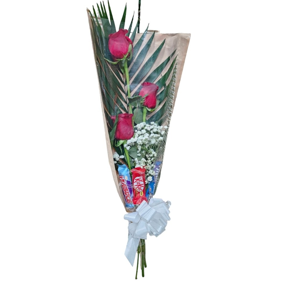 Una composizione floreale di 3 rose con una barretta di cioccolato è un regalo affascinante che combina l'eleganza senza tempo delle rose con il dolce piacere del cioccolato. Questa disposizione è perfetta per esprimere amore, gratitudine o amicizia. Le tre rose trasmettono un messaggio di affetto intenso e profondo, mentre la barretta di cioccolato aggiunge un tocco indulgente e speciale. È un regalo perfetto per sorprendere quella persona speciale in ogni occasione