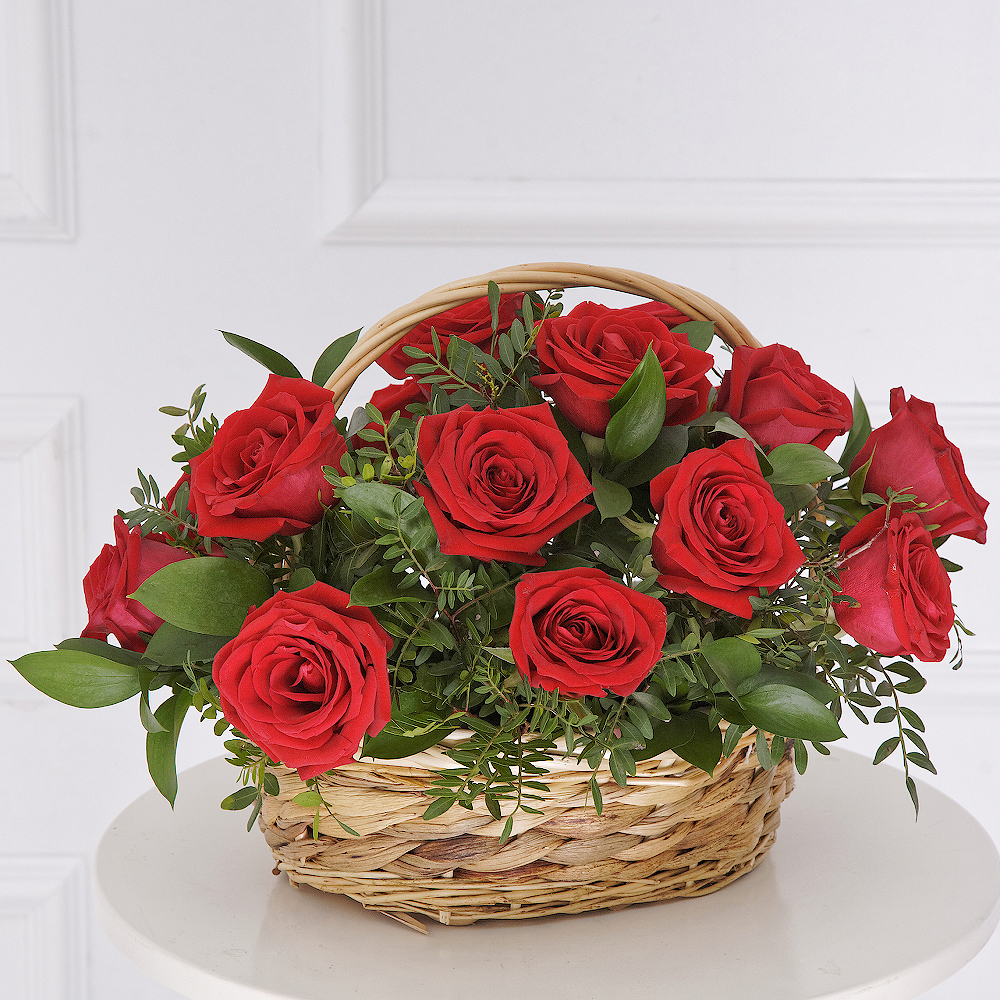 Concediti la tua persona speciale con questa bella composizione floreale piena di splendore ed eleganza. Un grande cesto di rose profumate e belle foglie di ruscus e pistacchio sono sicuri di conquistare il suo cuore.