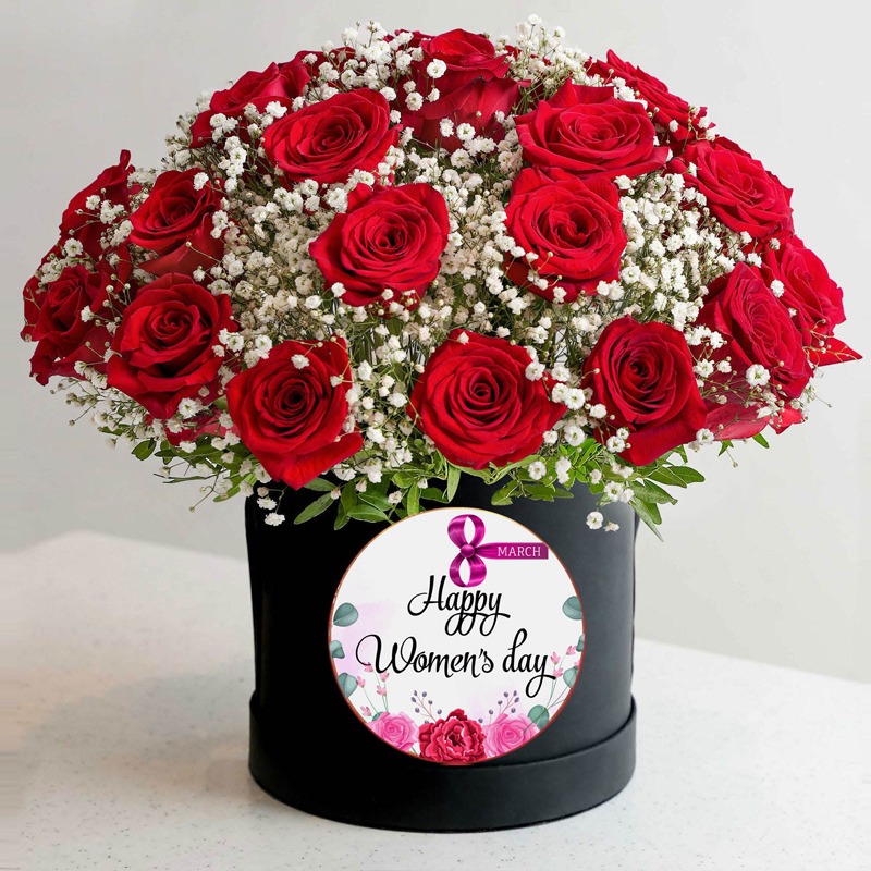 35 rose rosse in una scatola a cappello ornata di gesso, con un adesivo per la Giornata Internazionale della Donna
