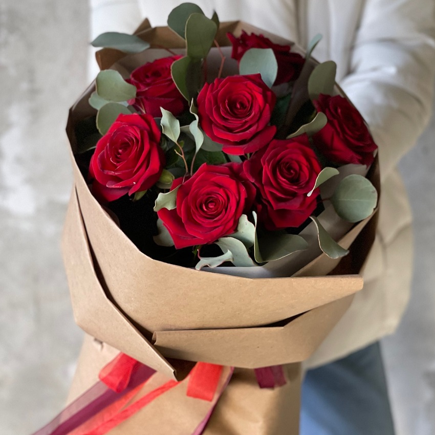 Un bouquet di 7 rose bordeaux e verde decorativo in confezione di rose.