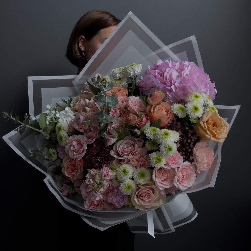 Un magnifico mazzo con rose, mini-rose, ortensie, peonie, garofani ed eucalipto. La dimensione è Grande, con un'altezza di 50 cm. Nota: Utilizziamo fiori freschi di stagione, quindi la composizione del mazzo potrebbe variare leggermente. Anche in assenza di un fiore di stagione, cerchiamo di creare un mazzo il più simile possibile. Se un fiore particolare è importante per te, contattaci con una nota e troveremo insieme le soluzioni più adatte.