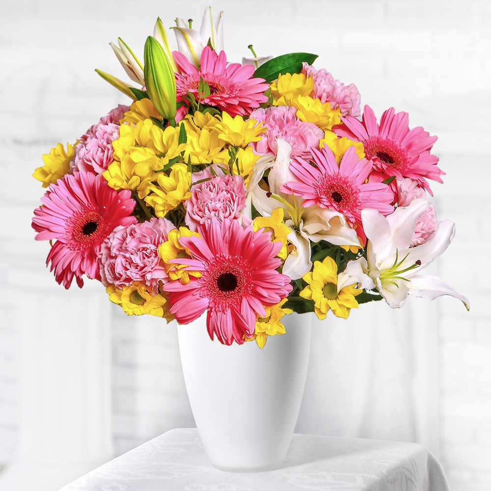 Il bouquet "Sogni Rosa" è una combinazione delicata e romantica di crisantemi a cespuglio, garofani, gerbere, gigli e pistacchi. Questo bouquet regalerà al destinatario una sensazione di leggerezza e ariosità, riempirà lo spazio con un profumo sottile e fascino. Ogni fiore in questo bouquet ha il proprio significato: - i crisantemi a cespuglio simboleggiano gioia e felicità; - i garofani aggiungono freschezza e leggerezza alla composizione; - le gerbere portano nel bouquet luminosità e originalità; - i gigli significano purezza e tenerezza; - il pistacchio serve come tocco finale, conferendo al bouquet raffinatezza ed eleganza. Il bouquet "Sogni Rosa" è adatto per qualsiasi occasione romantica - delizierà con la sua bellezza e il suo profumo, creando un'atmosfera di tenerezza e amore. Fate la vostra scelta a favore della qualità e dell'unicità - scegliete il nostro bouquet "Sogni Rosa"!