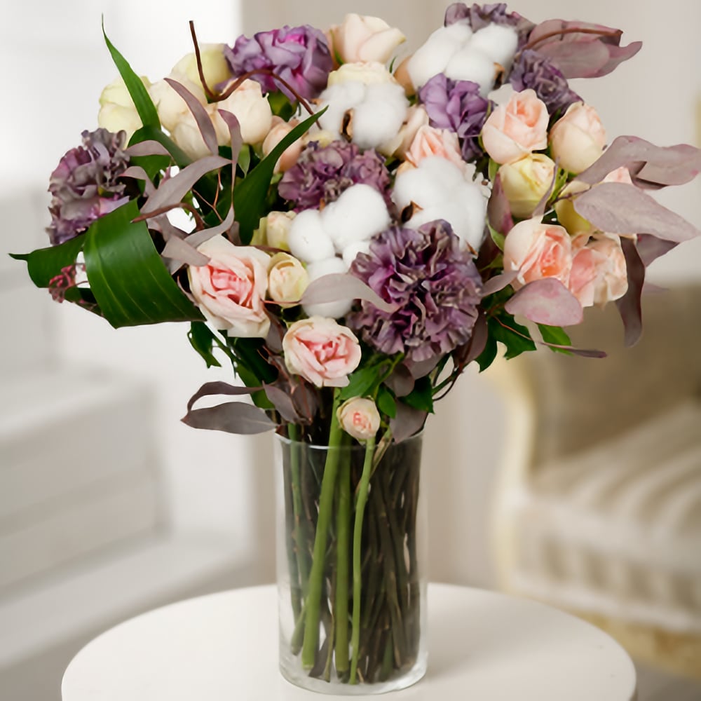 Sorprendi la tua persona speciale con questo bouquet elegante e sofisticato. Rari garofani viola scuro mescolati con delicate rose spray color crema e incorniciati da foglie di eucalipto e aspidistra con soffici accenti di cotone per impressionare qualsiasi destinatario!