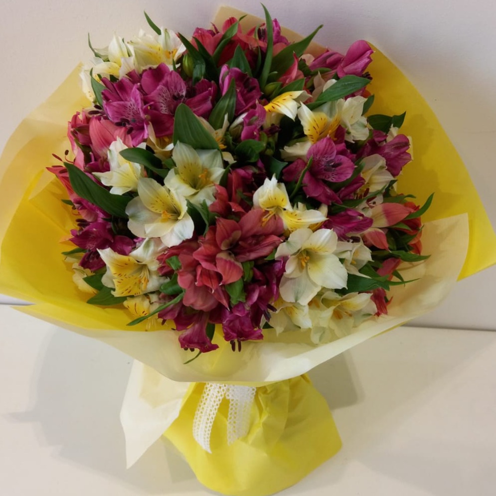 Un bouquet di 30 alstroemerie in una confezione moderna, con un fiocco di raso.