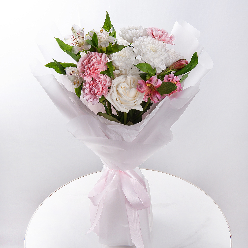 Volate sulle ali dell'amore! Una straordinaria combinazione di gerbere brillanti, giacinti profumati e delicate alstroemerie. I garofani e le fresie aggiungono raffinatezza al bouquet, mentre il pist…