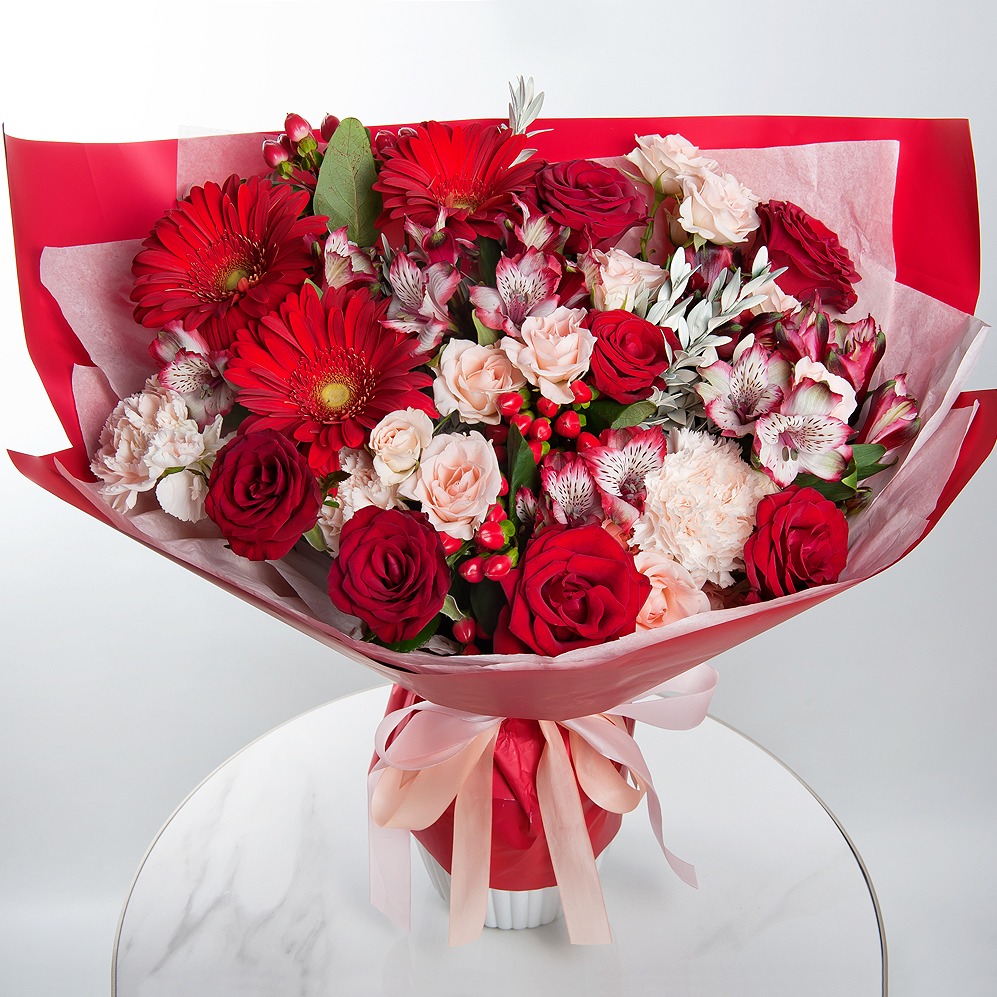 Il bouquet "Tango" è un bellissimo bouquet composto da diversi fiori. Questo bouquet presenta allegre gerbere, eleganti rose alte 50-60cm e profumate rose arbustive. Oltre a questi fiori, ci sono anc…