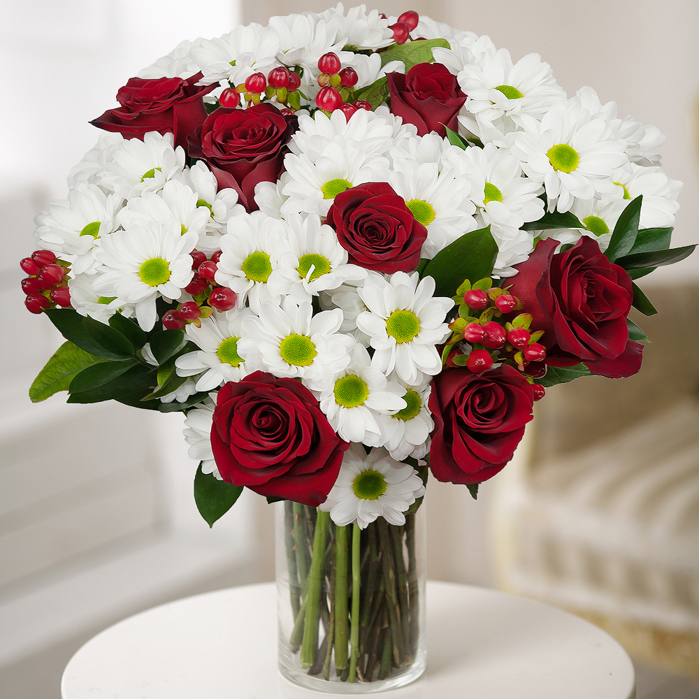 Bellissimi crisantemi bianchi come la neve con un tocco di affascinanti rose rosse sono un regalo perfetto per il tuo destinatario speciale che parlerà dei tuoi sentimenti meglio di qualsiasi parola.