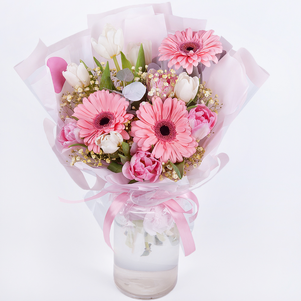 Il bouquet "Bacio di Primavera" è l'incarnazione della tenerezza e della bellezza, che regalerà al destinatario una sensazione di freschezza e leggerezza. In questo bouquet si combinano armoniosamente tulipani, gerbere, gipsofila e eucalipto "Cineraria". Ogni fiore ha il suo significato: i tulipani simboleggiano amore e ammirazione, le gerbere rappresentano gioia e ottimismo, la gipsofila aggiunge al bouquet ariosità e leggerezza, e l'eucalipto "Cineraria" lo riempie di freschezza. Il bouquet "Bacio di Primavera" è creato da fioristi esperti utilizzando solo fiori freschi. Delizierà il destinatario con la sua bellezza e il suo profumo per diversi giorni. Questo bouquet sarà un regalo meraviglioso per qualsiasi occasione - sia esso un compleanno, un anniversario o semplicemente il desiderio di fare piacere a una persona cara.
