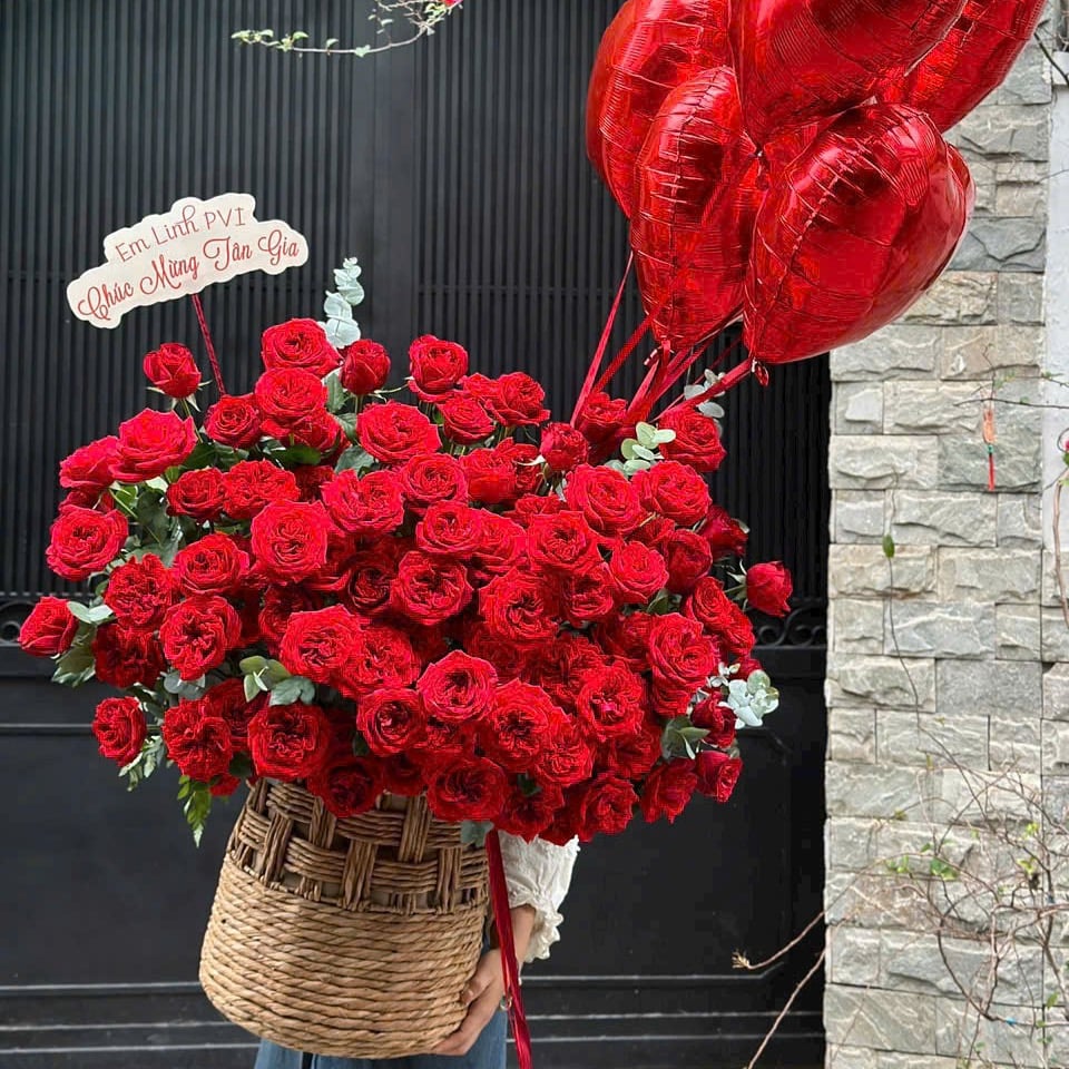 Esprimi il tuo amore con questo gesto romantico — un magnifico bouquet di rose rosse, accompagnato da allegri palloncini a forma di cuore. Questa splendida composizione presenta circa 101 rose rosse vivaci, disposte in modo denso in un bouquet classico e rotondo. Ogni rosa vanta una texture ricca e vellutata e una tonalità di rosso profondo e appassionato. Un tocco di fantasia e festività arriva dai cinque grandi palloncini rossi a forma di cuore, legati insieme e che fluttuano sopra le rose. Il contrasto tra la bellezza floreale senza tempo e i palloncini giocosi crea un allestimento visivamente accattivante e gioioso. L'impressione generale è di amore, celebrazione e affetto sincero.