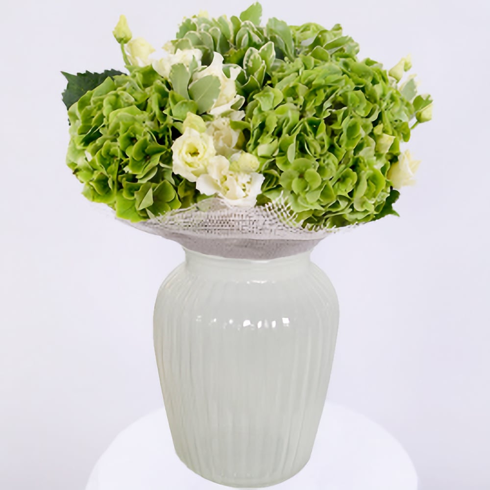 Mazzo 'Vibrazioni Fresche: Ortensie verdi e eustoma bianchi'